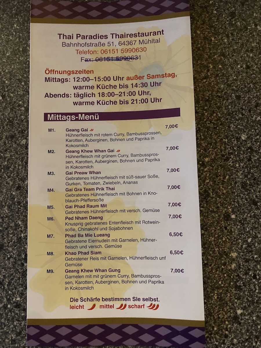 Welcome to Thai Paradies, a hidden gem located at Bahnhofstraße 51, 64367 Muhltal, Germany. This restaurant offers an authentic taste of Thai cuisine that keeps patrons returning for more. Customers rave about the freshness of the dishes, with highlights such as spring rolls and satay chicken making frequent appearances among favorites. The signature Thai basil chicken is a must-try, showcasing the restaurant's commitment to homemade flavors that transport you straight to Thailand.
